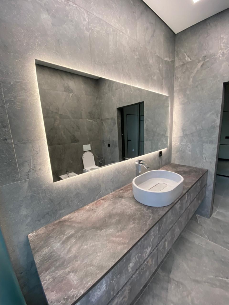 Зеркало не спорит с плиткой, мебелью и светом — оно выглядит так, будто изначально было частью проекта.